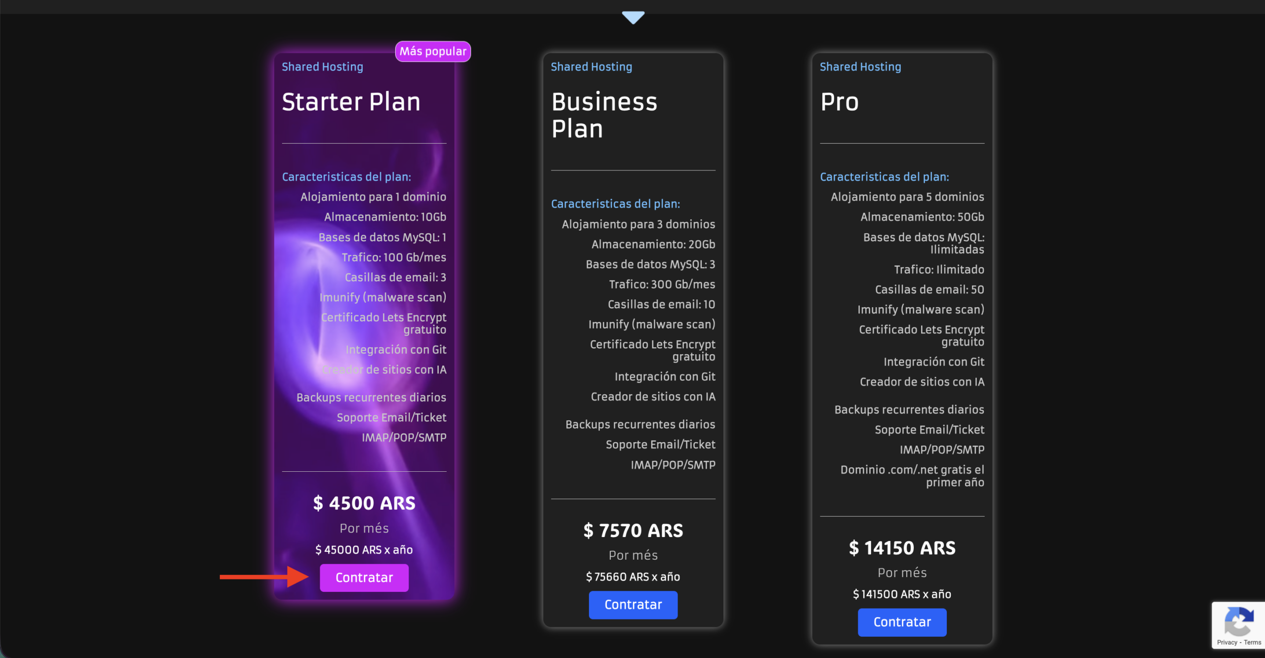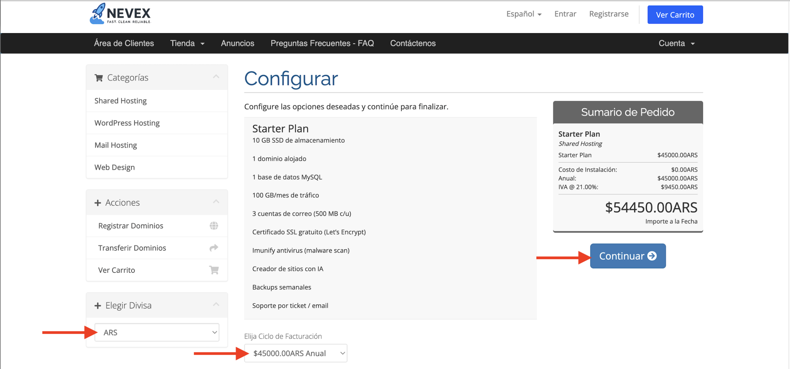 Es muy sencillo, primero accede a Nevex AR Hosting, y elegir el servicio que queres adquirir.