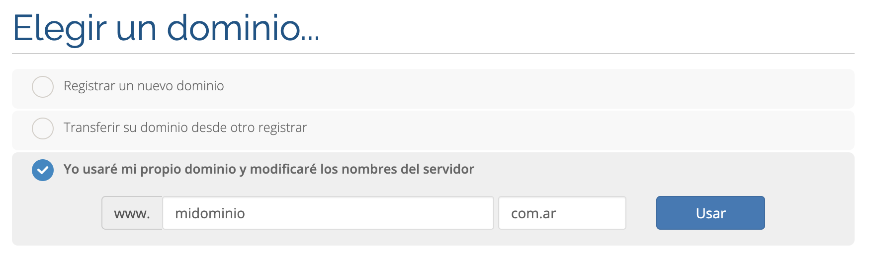 - Yo usaré mi propio dominio y modificaré los nombres del servidor: Si has adquirido un dominio desde Nic.ar, ya sea .com.ar o .ar, esta es tu opción.