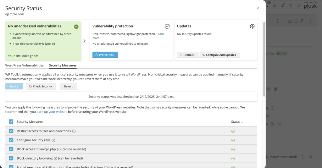 Con solo unos clics, activá todas las políticas de seguridad recomendadas por WP-Toolkit para proteger tu sitio: endurecimiento del núcleo, bloqueo de accesos no autorizados, comprobación de permisos, protección contra bots y mucho más, todo automatizado para que tu WordPress esté siempre seguro y actualizado.