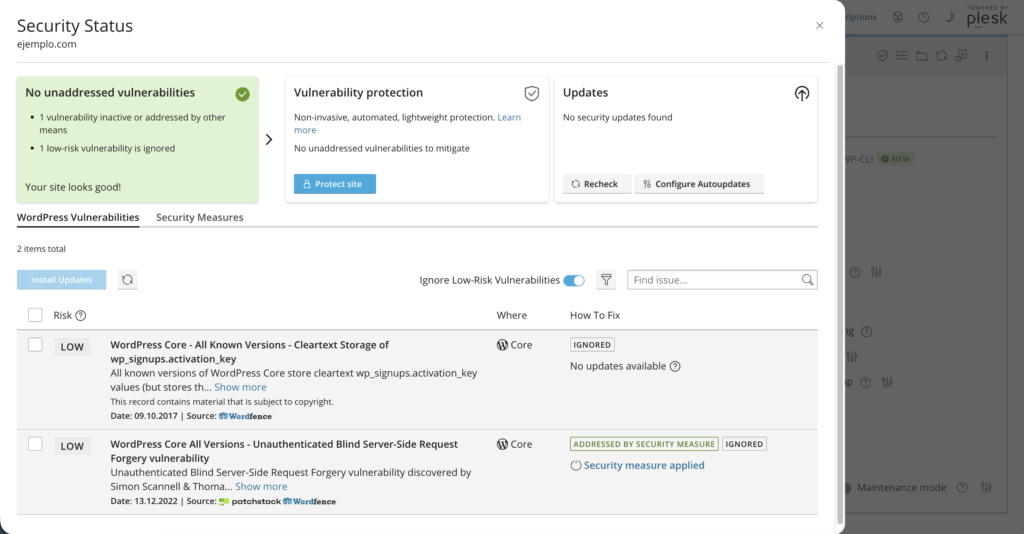 Con solo unos clics, realizá una revisión completa de vulnerabilidades en tus plugins y temas. WP-Toolkit detecta fallos de seguridad conocidos y te sugiere las acciones recomendadas para mitigarlos, manteniendo tu sitio protegido sin demasiado esfuerzo.