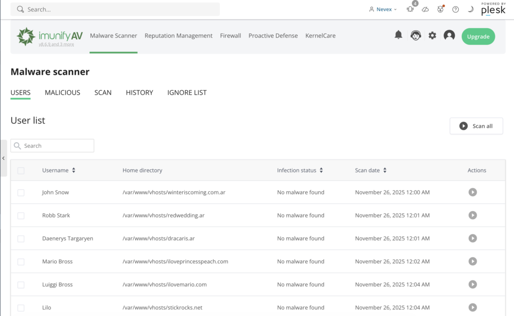 Escaneá tus archivos en busca de malware. O deja que Imunify lo haga automáticamente. El sistema analiza tu sitio de forma continua y detecta amenazas antes de que se conviertan en un problema.